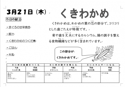 あす22日(金)は修了式のため給食は無く、本日が今年度最後の給食となりました。給食業務に携わっておられるすべての方に感謝申しあげます。昨年の4月から一年間大変お世話になり、誠にありがとうございました。