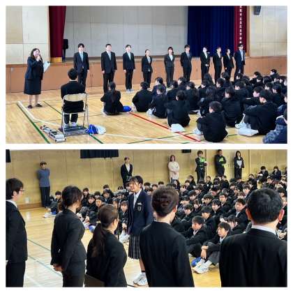 着任式では、新転任の先生方の紹介があり、先生と生徒からのあいさつがありました。