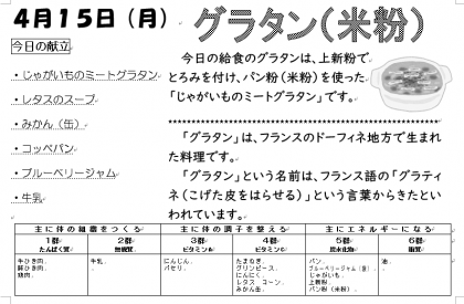 「コッペパン・ブルーベリージャム」、牛ひき肉・豚ひき肉・たまねぎ・グリンピースたっぷりの「じゃがいものミートグラタン」、鶏肉とレタス・にんじん・コーン・パセリなどの「レタスのスープ」、「みかん」などをおいしくいただきました。