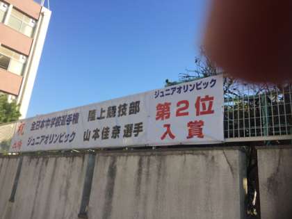 「山本選手の横断幕に栄光の表示」 公開日 2015/11/06 更新日 2015/11/06 できごと 正門南側の横断幕に、女子砲丸投げ、山本選手のジュニアオリンピック2位の記録が掲げられました。 いいね(0)