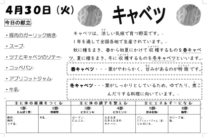 明日から5月。明日の献立は、「ごはん」、「ホイコウロー」、「中華スープ」、「きゅうりのピリ辛あえ」などです。