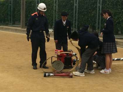 貯水槽に貯めてある水を用いての放水訓練です。意外と力のいる放水ですが、実際に体験しました。
