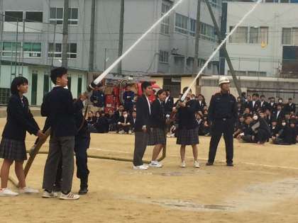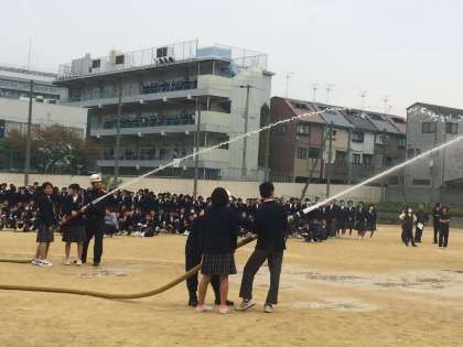 今日は、住吉消防署から隊員の皆さんに指導をいただき、消火訓練も行いました。