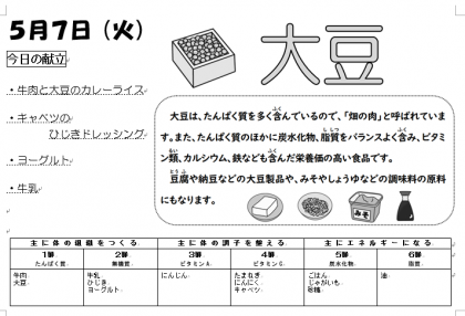 じゃがいも・たまねぎ・にんじんなどがたっぷりの「牛肉と大豆のカレーライス」、「キャベツのひじきドレッシング」、「ヨーグルト」などをおいしくいただきました。