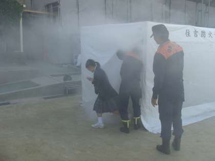 体験は、「実際の煙を体験する」「消火器の使い方」「三角巾を使った応急措置」などです。