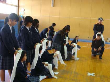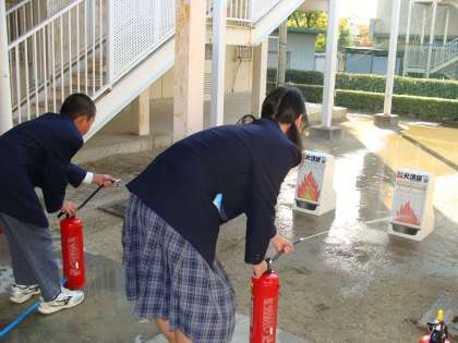 1年生は、前回の避難訓練に続き、今日11日(水)5、6時間目、防災訓練を消防隊の皆さんの指導を受けながら、体験学習として行いました。