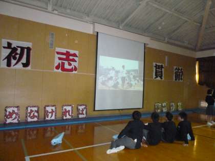 続いて、体育大会組体操を展示発表をしています。子どもたちは、振り返って自分たちの演技を見なしていました。