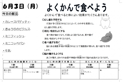 「ミニコッペパン」、豚ひき肉・ベーコン・トマト・たまねぎ・にんじん・ピーマン・にんにくなどがたっぷりの「カレースパゲッティ」、「きゅうりのピクルス」、「ミニフィッシュ」などをおいしくいただきました。