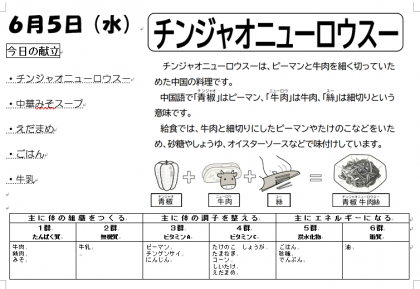 本日の給食は上記の通りです。「ごはん」「チンジャオニューロウスー」、鶏肉・チンゲンサイ・たまねぎ・にんじん・コーン・しいたけなどがたっぷりの「中華みそスープ」、「えだまめ」などをおいしくいただきました。