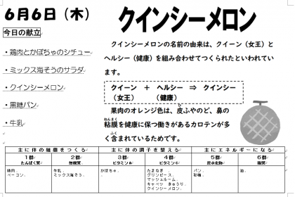 「黒糖パン」、ベーコン・たまねぎ・グリンピース・マッシュルームなどを煮た「鶏肉とかぼちゃのシチュー」、「ミックス海藻のサラダ」、「クインシーメロン」などをおいしくいただきました。