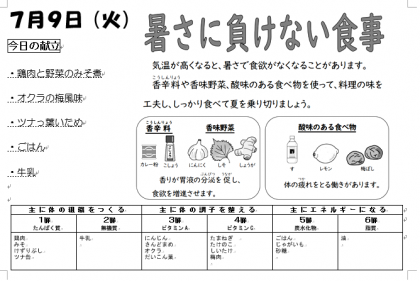 「ごはん」、じゃがいも・たまねぎ・にんじん・三度豆・しいたけ・たけのこなどを赤みそで味付けした「鶏肉と野菜のみそ煮」、「オクラの梅風味」、大根の葉をいためた「ツナっ葉いため」をごはんに添えておいしくいただきました。