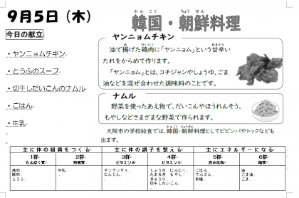 ヤンニョムとは、韓国料理で使われる「合わせ調味料」のこと。「韓国の甘辛ソース」とも表現する方がいます。ヤンニョムを鶏肉にからませた「ヤンニョムチキン」、豚肉・とうふ・たまねぎ・にんじん・チンゲンサイなどを煮た「とうふのスープ」、「切り干し大根のナムル」などをおいしくいただきました。