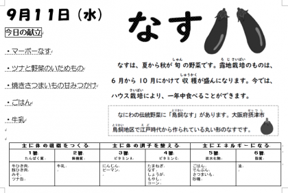「ごはん」、牛ひき肉・豚ひき肉をしょうが・トウバンジャンといため、たまねぎ・なす・にんじん・ピーマンをいためて煮た「マーボーなす」、「ツナと野菜のいためもの」、「焼きさつまいもの甘みつかけ」などをおいしくいただきました。