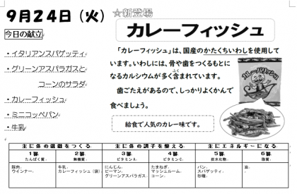 「ミニコッペパン」、ワインで下味をつけた豚肉やウインナー・たまねぎ・にんじん・ピーマン・マッシュルームなどがたっぷり入った「イタリアンスパゲッティ」、「グリーンアスパラガスとコーンのサラダ」、初登場らしき「カレーフィッシュ」などをおいしくいただきました。