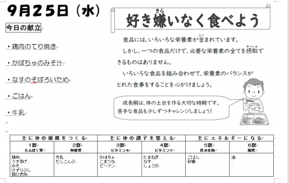 「ごはん」、「鶏肉のてり焼き」、うすあげやかぼちゃ・たまねぎ・小松菜(な)など野菜たっぷりの「かぼちゃのみそ汁」、豚ひき肉・なす・ピーマン・しょうがなどをいためた「なすのそぼろいため」などをおいしくいただきました。