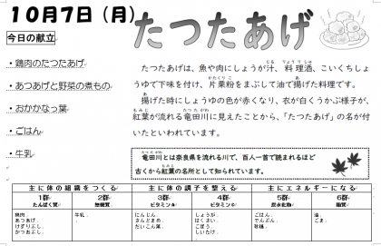 かつおぶし・大根葉・いりごまなどの「おかか菜っ葉」を「ごはん」に添え、子どもたちに人気の「鶏肉のたつたあげ」、白菜・にんじん・ごぼう・三度豆・しいたけなどを煮た「厚あげと野菜の煮もの」、などをおいしくいただきました。