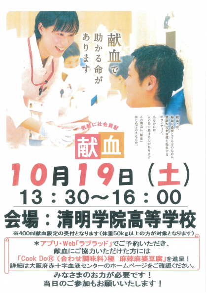 本校の隣の清明学院高等学校を会場として献血が行われます。
