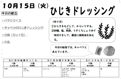 牛肉とじゃがいも・たまねぎ・にんじん・グリンピース・セロリなどの野菜もたっぷりの「ハヤシライス」、「キャベツのひじきドレッシング」、「白桃」などをおいしくいただきました。