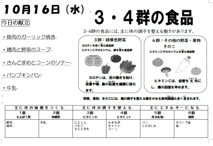 「パンプキンパン」、玉ねぎを混ぜ合わせた「豚肉のガーリック焼き」、じゃがいも・キャベツ・にんじん・パセリなどの野菜たっぷりの「鶏肉と野菜のスープ」、「三度豆とコーンのソテー」などをおいしくいただきました。