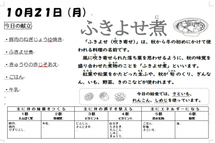 「ごはん」、料理酒やみりん・濃い口しょうゆなどで下味をつけた「豚肉のねぎじょうゆ焼き」、「ふきよせ煮」、「きゅうりの赤じそあえ」などをおいしくいただきました。