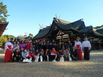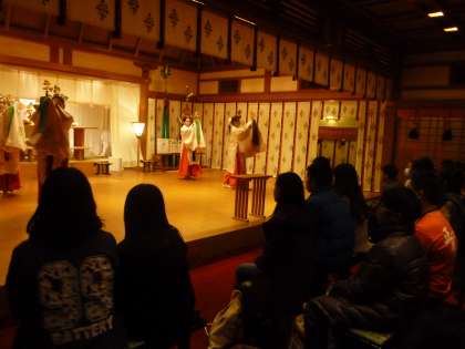 いよいよ神殿に向かい、神楽殿で巫女さんによる神楽の舞を特別に見せていただき、神主さんから、旅行の安全を祈願して、お払いも受けることができました。