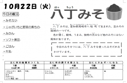 「ごはん」、なたね油であげたヒレカツに八丁みそをかけた「みそカツ」、料理酒で下味をつけた鶏肉に、にんじん・玉ねぎ・たけのこ・こんにゃくなどを煮た「じゃがいもと野菜の煮物」、「みかん」、「ソフト黒豆」などをおいしくいただきました。