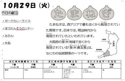 豚肉とじゃがいも・たまねぎ・にんじん・グリンピースなどの野菜たっぷりの中にニンニクをいためた「ポークカレーライス」、コーンといためた「ほうれん草のソテー」、「みかん」などをおいしくいただきました。