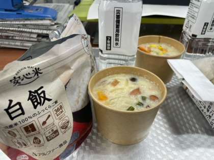 ポトフとアルファ米、オムレツなどを作っていただき、美味しく食べました。