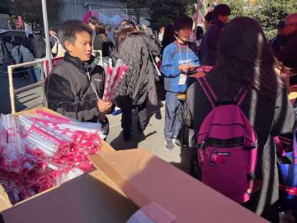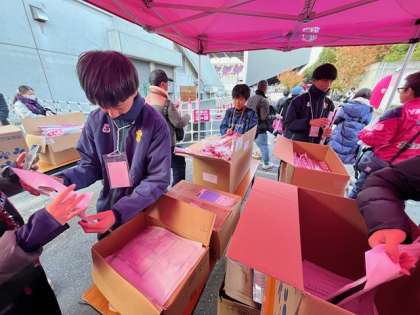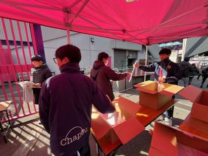 本日、ヨドコウ桜スタジアムで開催られるセレッソvs鹿島戦のボランティアスタッフとして、入場ゲートでチラシやフラッグを配布しました。来場されたお客さん1人1人に配布できました。