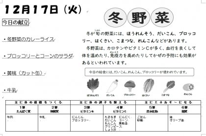 野菜の値が高いと嘆く声をよく聞きますが、野菜たっぷりの「冬野菜のカレーライス」で体もポカポカ、「ブロッコリーとコーンのサラダ」、「黄桃」などをおいしくいただきました。