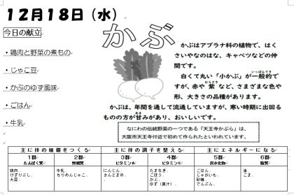 「ごはん」、じゃがいも・こんにゃく・たまねぎ・にんじん・ごぼう・三度豆などの野菜たっぷりの「鶏肉と野菜の煮もの」、ちりめんじゃこと大豆をなたね油であげた「じゃこ豆」、「かぶのゆず風味」などをおいしくいただきました。