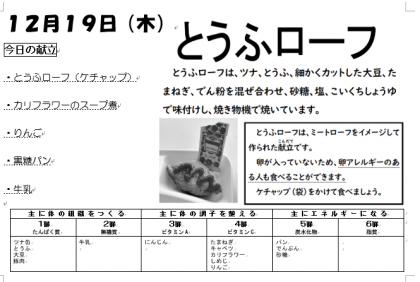 「黒糖パン」、「とうふローフ(ケチャップ)」、豚肉とキャベツ・にんじん・カリフラワー・しめじなどを煮た「カリフラワーのスープ煮」、「りんご」などをおいしくいただきました。