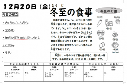 週明け23日の月曜日は、「コッペパン・ソフトマーガリン」、「カレーうどん」、「白菜のおひたし」、「ミニフィッシュ」などで今年最後の給食となります。