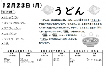 本日で今年最後の給食となりました。いつも温かくておいしい給食をごちそうになりました。学校給食に携わっていただいてる皆様にお礼を申しあげます。ありがとうございました。