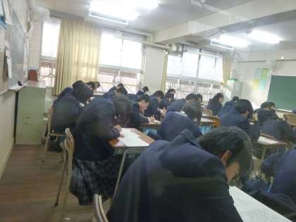 3年生は、連休前の1日目に続き、本日、12日(火)第5回進路実力テストの後半、社会、理科に挑んでいます。
