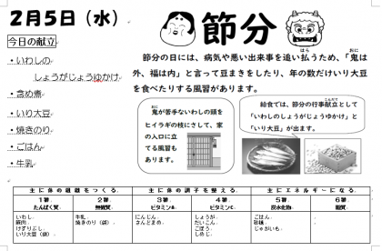 「ごはん」、「イワシのしょうがじょうゆかけ」、豚肉とじゃがいも・大根・にんじん・ごぼう・三度豆・しめじなどを煮た「含め煮」、「いり大豆」、「焼きのり」などをおいしくいただきました。