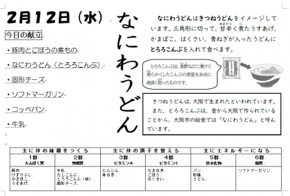 「コッペパン・ソフトマーガリン」、料理酒で下味をつけた豚肉に玉ねぎ・ごぼう・にんじんなどを煮た「豚肉とごぼうの煮物」、かまぼこ・うすあげ・白菜・青ねぎなども入った「なにわうどん(とろろ昆布)」、「固形チーズ」などをおいしくいただきました。