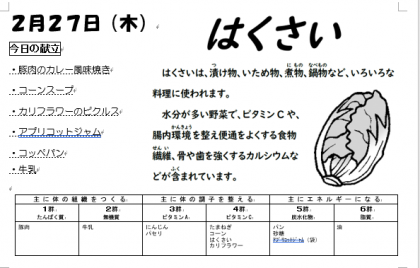 明日も3年生のみですが、献立は「ごはん」、「赤魚のレモンじょうゆかけ」、「さつまいものみそ汁」、「高野どうふのいり煮」などです。