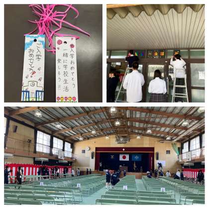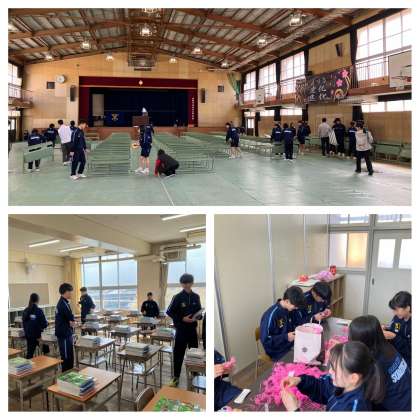 本日は朝から新2、3年生の担当生徒が入学式準備を行いました。体育館の設営をはじめ、校舎内の清掃や教科書配布準備、お祝いメッセージの作成など、それぞれの場所で新入生の皆さんのために頑張ってくれていました。本当にありがとうございました。