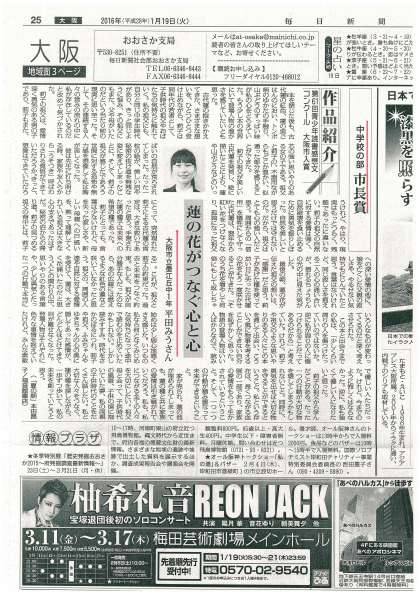 約5万の応募作品の中から、見事「大阪市長賞」を獲得しました、本校、平田さんの読書感想文全文が、19日の毎日新聞で大きく紹介されました。