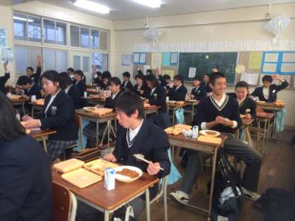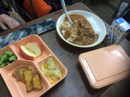 今日、22日(金)も肌寒い日となっていますが、給食では温かいハヤシライスが出ました。