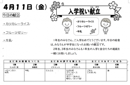 『入学祝い献立』として、定番の牛肉・じゃがいも・たまねぎ・にんじん・グリンピースに一口とんかつをのせる「カツカレーライス」、「フルーツ(ミカン・和なし)ゼリー」などをおいしくいただきました。