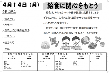 「ごはん」、白ねぎを加えて砂糖・みりん・こいくちしょうゆを煮立てた「焼きとり」、豚肉・うすあげ・玉ねぎ・キャベツ・にんじん・わかめなどを煮た「みそ汁」、「もやしのゆずの香あえ」、「焼きのり」などをおいしくいただきました。