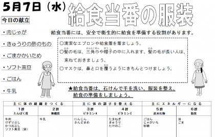 牛肉・にんじん・玉ねぎ・じゃがいも・さんどまめを煮た「肉じゃが」、「きゅうりの酢のもの」、たけのこを使った「ごまかかいため」、「ソフト黒豆」などをおいしくいただきました。