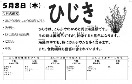 「あかうおのしょうゆだれかけ」、豚肉・じゃがいも・たまねぎ・キャベツ・小松菜・しめじなどがたっぷりの「みそ汁」、「ひじきのいため煮」などをおいしくいただきました。