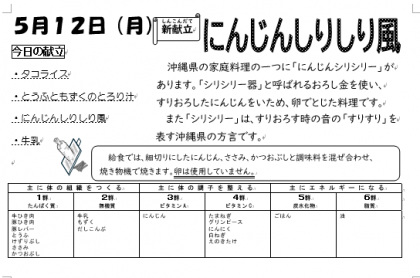 「タコライス」とは、味付けした牛や豚のひき肉(タコミート)とレタス、トマトやチーズなどメキシコ料理のタコスの具材をご飯にのせたファストフードで、「タコス」と「ライス」がドッキングしています。「とうふともずくのとろり汁」、「にんじんしりしり風」などとおいしくいただきました。