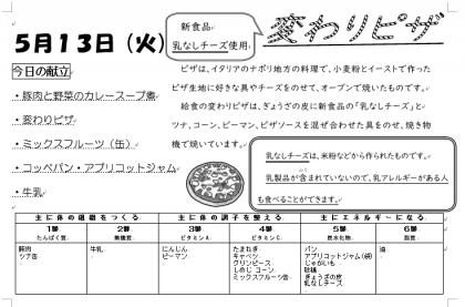 「コッペパン・アプリコットジャム」、じゃがいも・玉ねぎ・キャベツ・にんじん・グリンピース・しめじなどの野菜たっぷりな「豚肉と野菜のカレースープ煮」、「変わりピザ」、「ミックスフルーツ」などをおいしくいただきました。