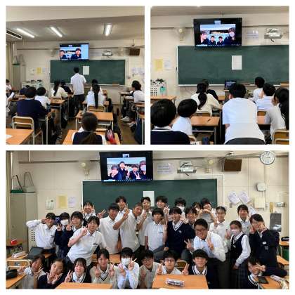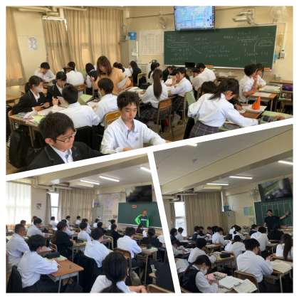 3年生は修学旅行まで1ヶ月をきりました。6限には隠岐の島町立西郷南中学校の生徒の皆さんとオンライン交流会を行いました。以前各クラスでお願いした質問やリクエストについて丁寧に答えていただきました。感想をお互いに共有し、その後各班で振り返り、プレゼン準備に向けて活動しました。当日の選択別体験で実際に西郷南中学校の皆さんと交流するメンバーもいます。ぜひ当日の出会いを大切にできるよう、気づきや学びを深めていってください。