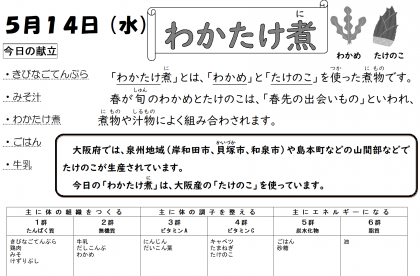「きびなごてんぷら」、鶏肉・にんじん・たまねぎ・キャベツ・だいこん葉が入った「みそ汁」、「わかたけ煮」、「ごはん」などをおいしくいただきました。