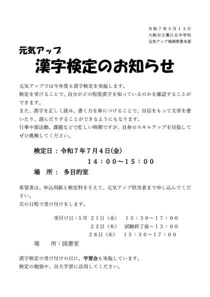 漢字検定 実施のお知らせ 公開日 2025/05/15 更新日 2025/05/15 お知らせ 元気アップよりお知らせです。 以下の日時において、漢字検定を実施します。 是非ご参加ください。 いいね(0)
